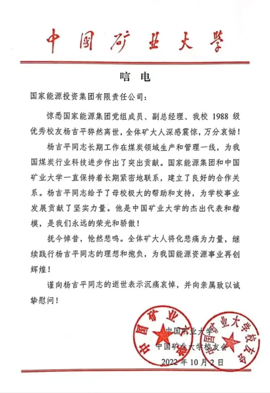 國家能源集團黨組成員、副總經理楊吉平同志,因突發(fā)疾病搶救無效,于2022年10月2日9時33分在北京不幸逝世,享年53歲。他的遺體送別會,于10月4日上午11:30在北京八寶山殯儀館舉行。