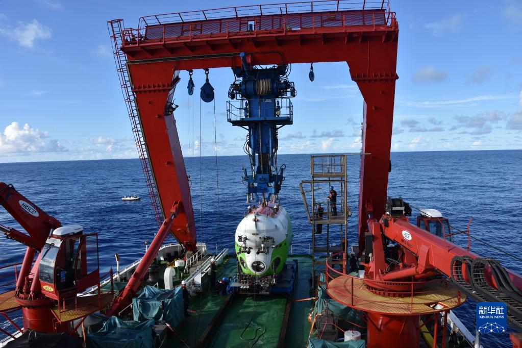 2021年8月18日,工作人員在西太平洋準備從“探索一號”科考船甲板布放“奮斗者”號。 新華社記者 陳凱姿 攝