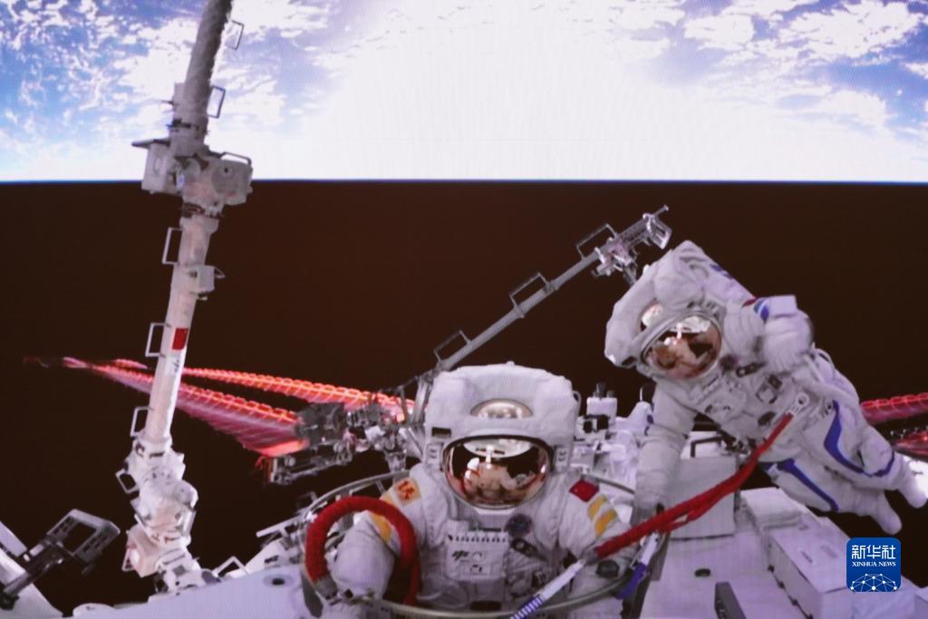 2022年9月2日在北京航天飛行控制中心拍攝的神舟十四號航天員劉洋(左)結(jié)束出艙任務正在返回的畫面。 新華社發(fā)(李杰攝)