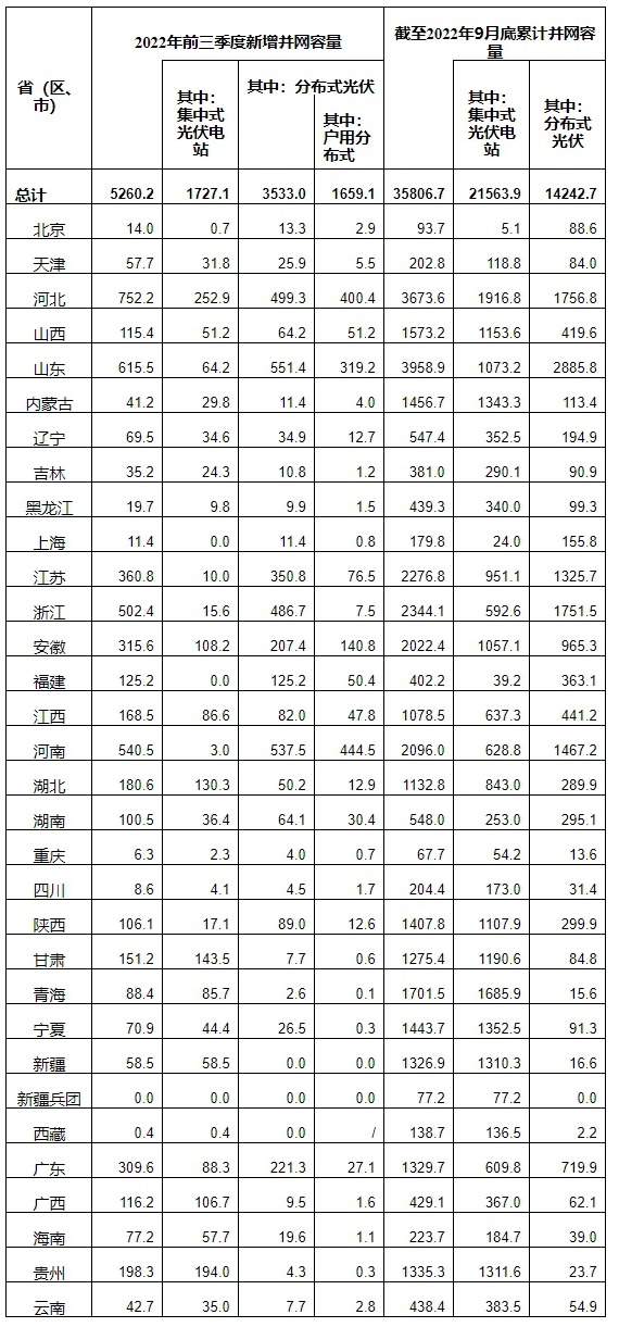 2022年前三季度光伏發(fā)電建設(shè)運(yùn)行情況 單位:萬千瓦