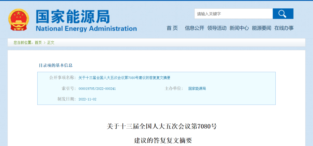 11月2日,國家能源局發(fā)布《關于十三屆全國人大五次會議第7080號建議的答復復文摘要》。