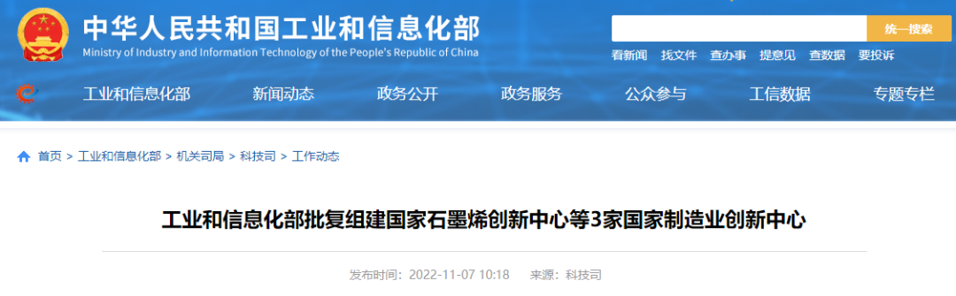 11月7日,工信部批復組建國家石墨烯創(chuàng)新中心等3家國家制造業(yè)創(chuàng)新中心。