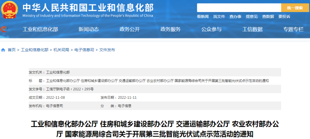 為進(jìn)一步促進(jìn)光伏產(chǎn)業(yè)與新一代信息技術(shù)深度融合,推動(dòng)智能光伏技術(shù)進(jìn)步和行業(yè)應(yīng)用,根據(jù)《智能光伏產(chǎn)業(yè)創(chuàng)新發(fā)展行動(dòng)計(jì)劃(2021—2025年)》(工信部聯(lián)電子〔2021〕226號(hào))工作部署,工業(yè)和信息化部、住房和城鄉(xiāng)建設(shè)部、交通運(yùn)輸部、農(nóng)業(yè)農(nóng)村部、國家能源局決定組織開展第三批智能光伏試點(diǎn)示范活動(dòng)。有關(guān)事項(xiàng)通知如下: