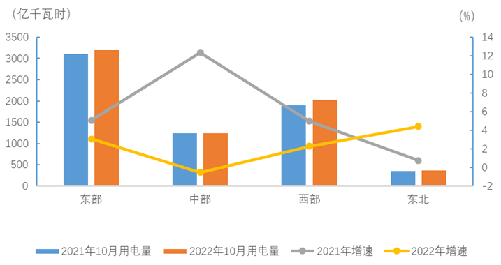 10月份,東、中、西部和東北地區(qū)全社會(huì)用電量增速分別為3.1%、-0.5%、2.3%和4.4%。
