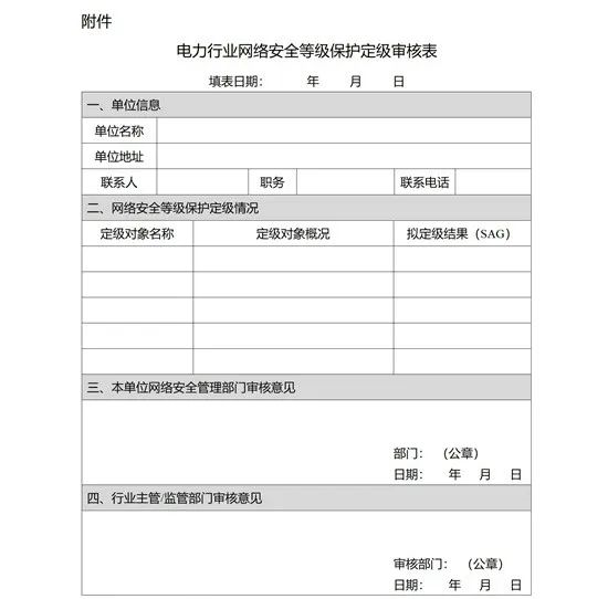 第九條 電力企業(yè)辦理網(wǎng)絡安全等級保護定級審核手續(xù)時,應當提交《電力行業(yè)網(wǎng)絡安全等級保護定級審核表》(詳見附件),含各定級對象的定級報告及專家評審意見。