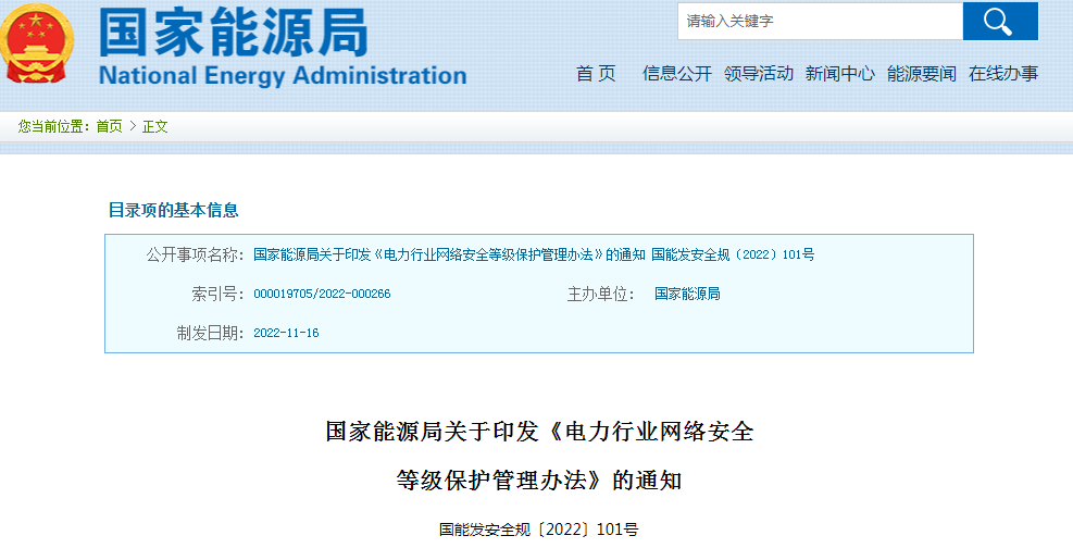 國家能源局關于印發(fā)《電力行業(yè)網(wǎng)絡安全等級保護管理辦法》的通知