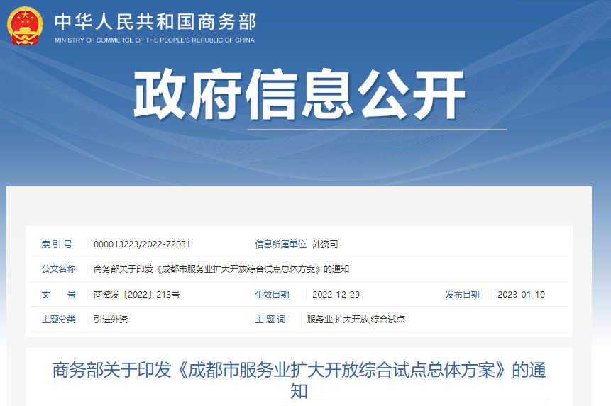 商務(wù)部關(guān)于印發(fā)《成都市服務(wù)業(yè)擴大開放綜合試點總體方案》的通知