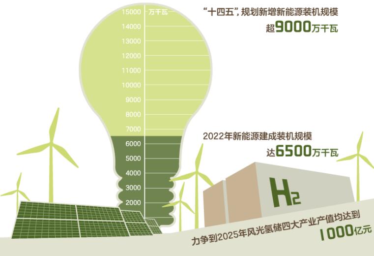 2022年,內(nèi)蒙古新能源建成裝機(jī)規(guī)模達(dá)到6500萬(wàn)千瓦,連續(xù)兩年成為全國(guó)唯一一個(gè)風(fēng)電光伏發(fā)電量超過1000億千瓦時(shí)的省區(qū)。“十四五”期間,內(nèi)蒙古規(guī)劃新增超過9000萬(wàn)千瓦的新能源裝機(jī)規(guī)模,力爭(zhēng)到2025年風(fēng)光氫儲(chǔ)四大產(chǎn)業(yè)產(chǎn)值均達(dá)到1000億元。