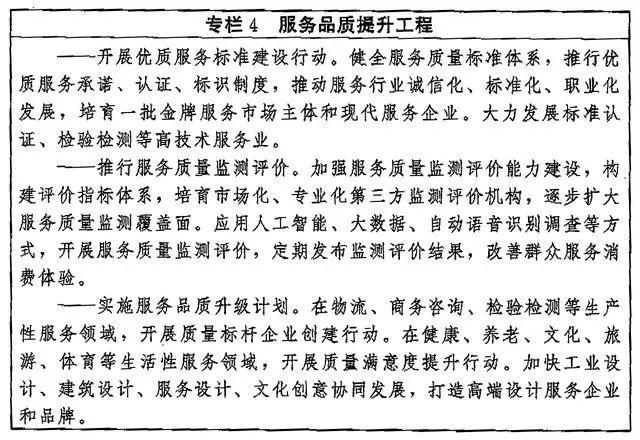 (七)提高產(chǎn)業(yè)質(zhì)量競爭水平。推動產(chǎn)業(yè)質(zhì)量升級,加強(qiáng)產(chǎn)業(yè)鏈全面質(zhì)量管理,著力提升關(guān)鍵環(huán)節(jié)、關(guān)鍵領(lǐng)域質(zhì)量管控水平。開展對標(biāo)達(dá)標(biāo)提升行動,以先進(jìn)標(biāo)準(zhǔn)助推傳統(tǒng)產(chǎn)業(yè)提質(zhì)增效和新興產(chǎn)業(yè)高起點(diǎn)發(fā)展。推進(jìn)農(nóng)業(yè)品種培優(yōu)、品質(zhì)提升、品牌打造和標(biāo)準(zhǔn)化生產(chǎn),全面提升農(nóng)業(yè)生產(chǎn)質(zhì)量效益。加快傳統(tǒng)制造業(yè)技術(shù)迭代和質(zhì)量升級,強(qiáng)化戰(zhàn)略性新興產(chǎn)業(yè)技術(shù)、質(zhì)量、管理協(xié)同創(chuàng)新,培育壯大質(zhì)量競爭型產(chǎn)業(yè),推動制造業(yè)高端化、智能化、綠色化發(fā)展,大力發(fā)展服務(wù)型制造。加快培育服務(wù)業(yè)新業(yè)態(tài)新模式,以質(zhì)量創(chuàng)新促進(jìn)服務(wù)場景再造、業(yè)務(wù)再造、管理再造,推動生產(chǎn)性服務(wù)業(yè)向?qū)I(yè)化和價值鏈高端延伸,推動生活性服務(wù)業(yè)向高品質(zhì)和多樣化升級。完善服務(wù)業(yè)質(zhì)量標(biāo)準(zhǔn),加強(qiáng)服務(wù)業(yè)質(zhì)量監(jiān)測,優(yōu)化服務(wù)業(yè)市場環(huán)境。加快大數(shù)據(jù)、網(wǎng)絡(luò)、人工智能等新技術(shù)的深度應(yīng)用,促進(jìn)現(xiàn)代服務(wù)業(yè)與先進(jìn)制造業(yè)、現(xiàn)代農(nóng)業(yè)融合發(fā)展。