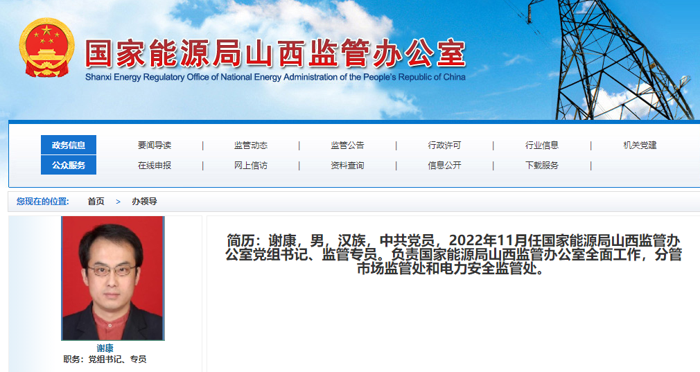 國(guó)家能源局山西監(jiān)管辦公室官網(wǎng)顯示,謝康已任國(guó)家能源局山西監(jiān)管辦公室黨組書(shū)記、監(jiān)管專員。