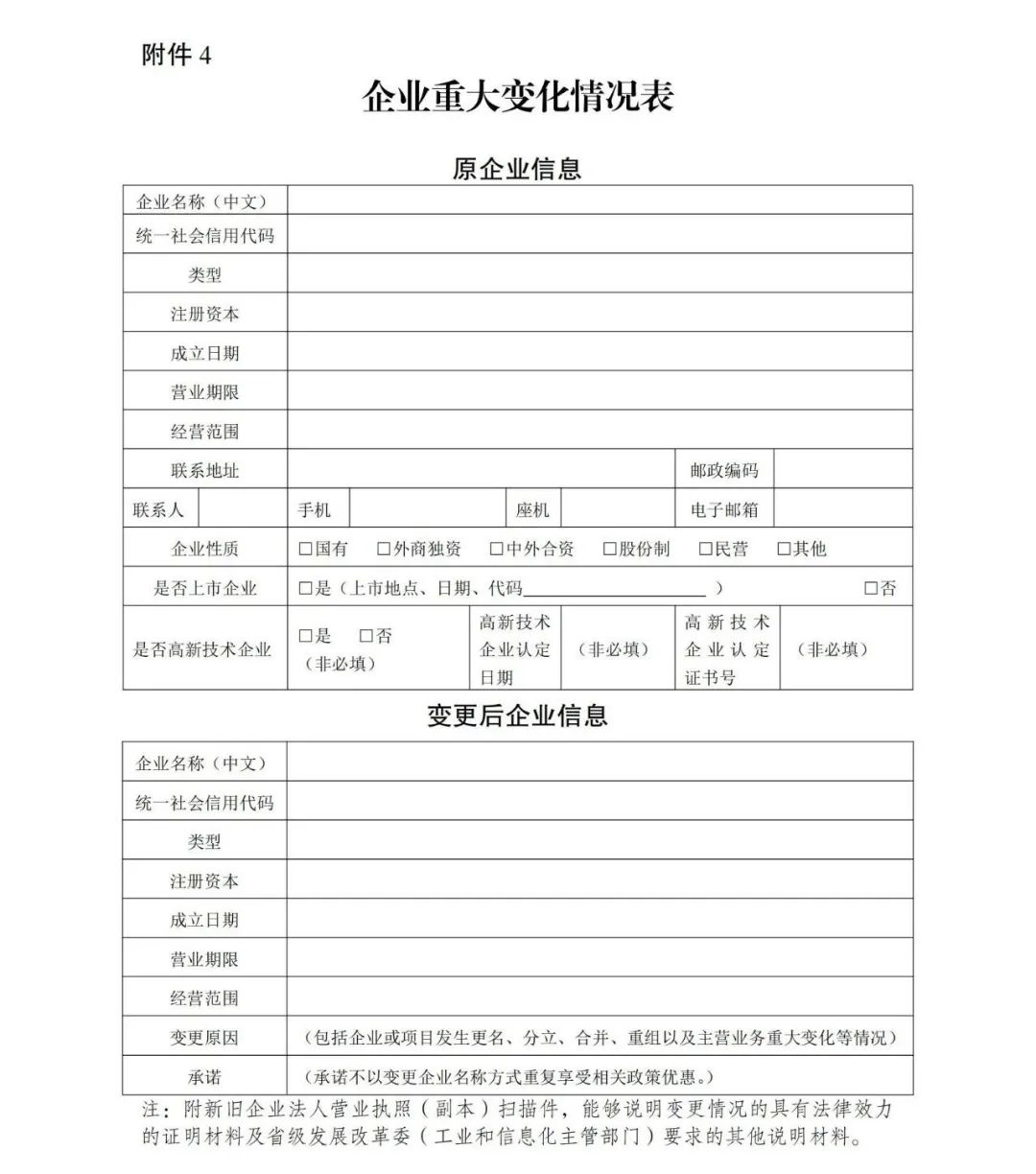 五、已享受《若干政策》第(一)、(三)、(六)、(七)條,以及財關(guān)稅〔2021〕4號文提及的關(guān)稅優(yōu)惠政策的企業(yè)或項目發(fā)生更名、分立、合并、重組以及主營業(yè)務(wù)重大變化等情況,應(yīng)及時向地方發(fā)改和工信部門報告,并于完成變更登記之日起60日內(nèi),將企業(yè)重大變化情況表和相關(guān)材料報送國家發(fā)展改革委、工業(yè)和信息化部(以省級部門上報文件落款日為準)。國家發(fā)展改革委、工業(yè)和信息化部會同相關(guān)部門確定發(fā)生變更情形后是否繼續(xù)符合享受優(yōu)惠政策的企業(yè)條件或項目標準。
