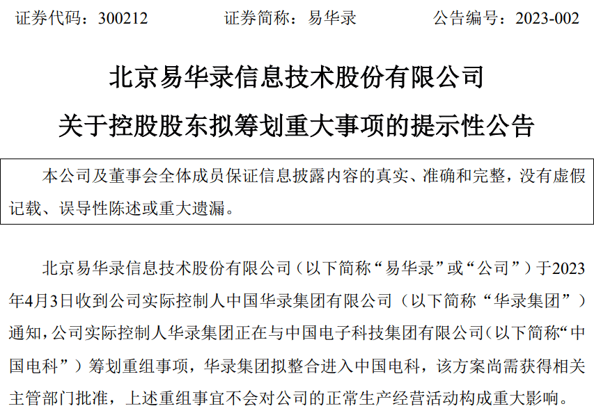 4月3日,北京易華錄信息技術股份有限公司發(fā)布公告稱,收到公司實際控制人中國華錄集團有限公司(以下簡稱“華錄集團”)通知,華錄集團正在與中國電子科技集團有限公司(以下簡稱“中國電科”)籌劃重組事項,華錄集團擬整合進入中國電科。易華錄表示,該方案尚需獲得相關主管部門批準,上述重組事宜不會對公司的正常生產(chǎn)經(jīng)營活動構成重大影響。公司將按照法律法規(guī)的要求及時披露進展情況。