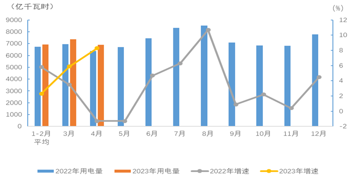 圖1 2022、2023年分月全社會(huì)用電量及其增速