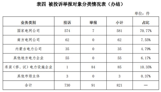 從被投訴舉報(bào)對(duì)象看,供電企業(yè)733件、占投訴舉報(bào)總數(shù)的89.28%,其中國(guó)家電網(wǎng)公司581件、占比70.77%,南方電網(wǎng)公司62件、占比7.55%,內(nèi)蒙古電力公司35件、占比3.65%,其他地方電力企業(yè)55件、占比6.17%;承裝(修、試)電力設(shè)施企業(yè)85件、占比10.35%;其他市場(chǎng)主體3件、占比0.37%。