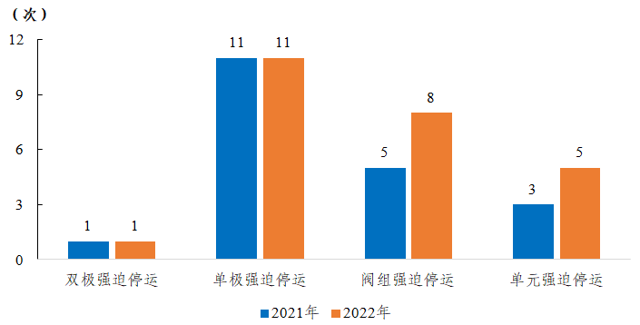2022年,納入電力可靠性統(tǒng)計的直流輸電系統(tǒng)發(fā)生25次強(qiáng)迫停運(yùn),其中雙極強(qiáng)迫停運(yùn)1次,與上一年持平;單極強(qiáng)迫停運(yùn)11次,與上一年持平;閥組強(qiáng)迫停運(yùn)8次,同比增加3次;單元強(qiáng)迫停運(yùn)5次,同比增加2次。各系統(tǒng)強(qiáng)迫停運(yùn)的等效停運(yùn)小時累計值為480.57小時。