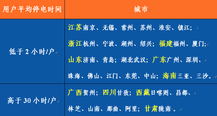 2022年,全國供電可靠性仍然呈現(xiàn)不均衡態(tài)勢,333個地級行政區(qū)中,61個地級行政區(qū)的平均供電可靠率高于99.95%,52個地級行政區(qū)的用戶平均供電可靠率低于99.80%。其中用戶平均停電時間低于2小時/戶的地級行政區(qū)有江蘇南京、無錫、常州、蘇州、淮安、鎮(zhèn)江;浙江杭州、寧波、湖州、紹興;福建福州、廈門;山東濟(jì)南、青島;湖北武漢;廣東廣州、深圳、珠海、佛山、江門、東莞、中山;海南三亞、三沙。高于30小時/戶的有廣西賀州;四川甘孜;西藏日喀則、昌都、林芝、山南、那曲、阿里;甘肅隴南。
