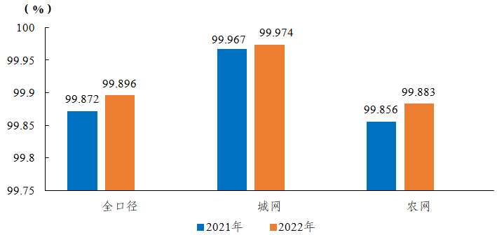 2022年,全國用戶平均供電可靠率99.896%,同比上升0.025個百分點(diǎn),其中,城網(wǎng)99.974%,農(nóng)網(wǎng)99.883%。城網(wǎng)與農(nóng)網(wǎng)相差0.091個百分點(diǎn)。