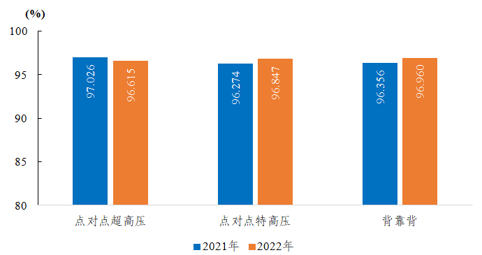 2022年,納入電力可靠性統(tǒng)計的點(diǎn)對點(diǎn)超高壓直流輸電系統(tǒng)能量可用率為96.615%,同比下降0.411個百分點(diǎn);點(diǎn)對點(diǎn)特高壓直流輸電系統(tǒng)能量可用率為96.847%,同比上升0.573個百分點(diǎn);背靠背直流輸電系統(tǒng)能量可用率為96.960%,同比上升0.604個百分點(diǎn)。