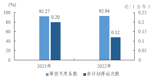 2022年輸變電設(shè)施運(yùn)行可靠性指標(biāo)總體位置在較高水平,十三類輸變電設(shè)施的可用系數(shù)保持在99.45%以上,強(qiáng)迫停運(yùn)率維持在0.3次/百千米(臺、套、段)年以下。