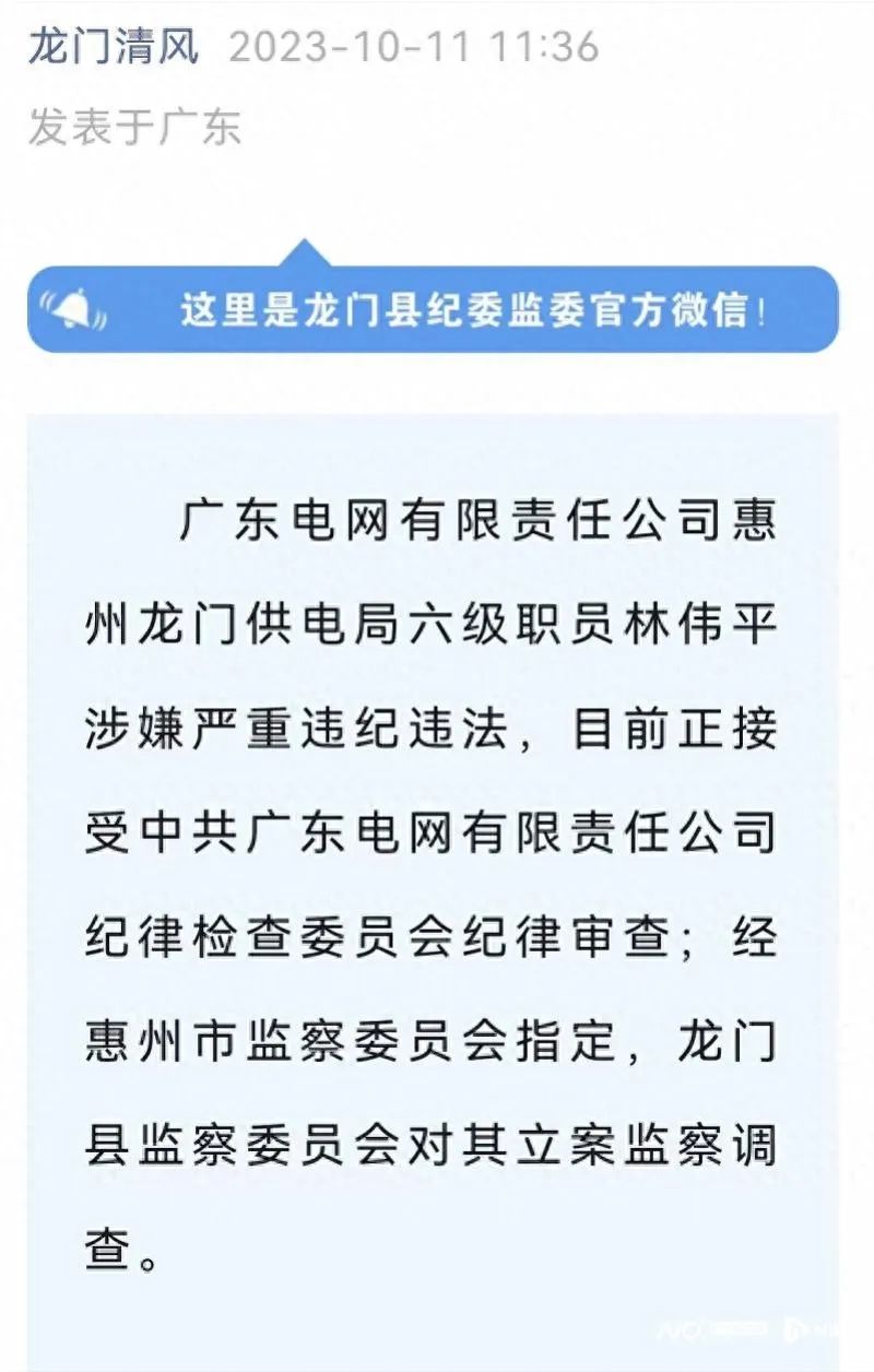廣東電網有限責任公司惠州龍門供電局六級職員林偉平涉嫌嚴重違紀違法,目前正接受中共廣東電網有限責任公司紀律檢查委員會紀律審查,經惠州市監(jiān)察委員會指定,龍門縣監(jiān)察委員會對其立案監(jiān)察調查。