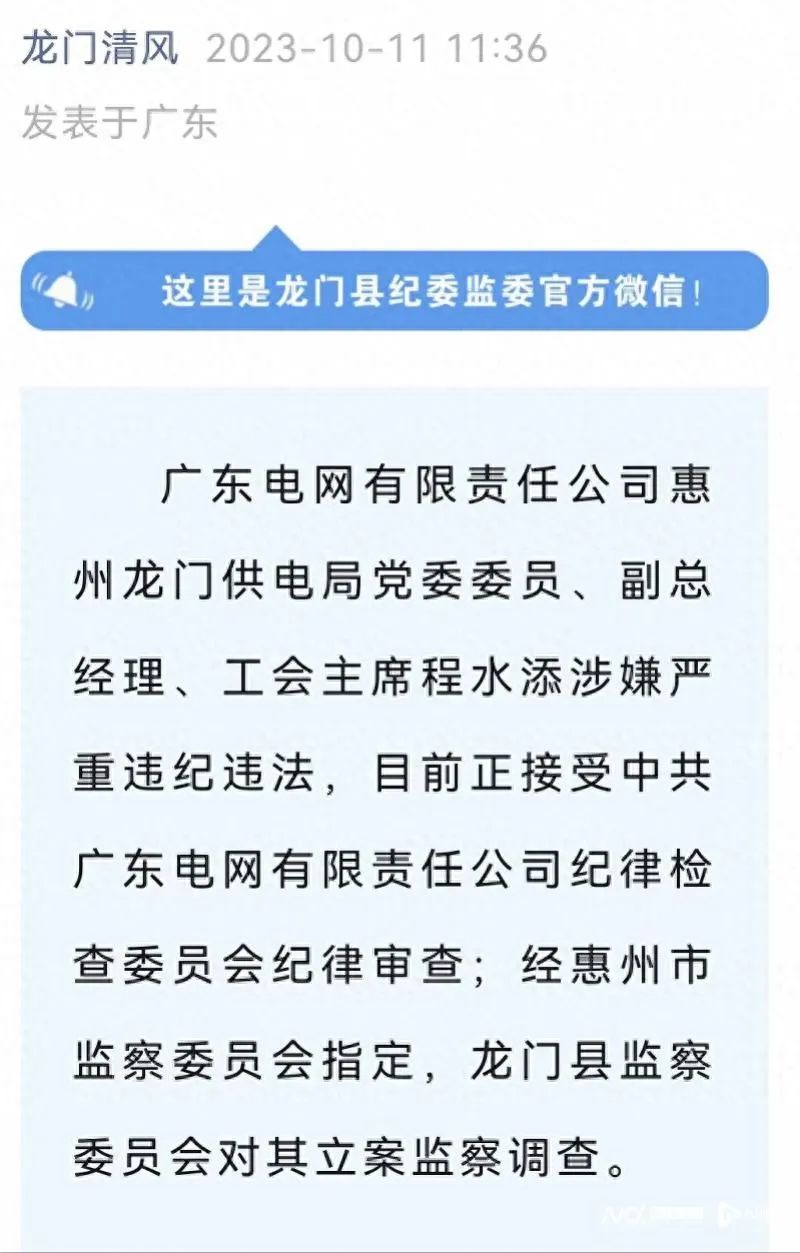 廣東電網有限責任公司惠州龍門供電局黨委委員、副總經理、工會主席程水添涉嫌嚴重違紀違法,目前正接受中共廣東電網有限責任公司紀律檢查委員會紀律審查,經惠州市監(jiān)察委員會指定,龍門縣監(jiān)察委員會對其立案監(jiān)察調查。