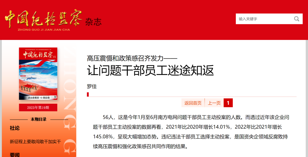 最新一期《中國紀檢監(jiān)察》雜志刊發(fā)了《高壓震懾和政策感召齊發(fā)力—— 讓問題干部員工迷途知返》一文,文中透露,今年1月至6月,南方電網共有56名問題干部員工主動“投案”。