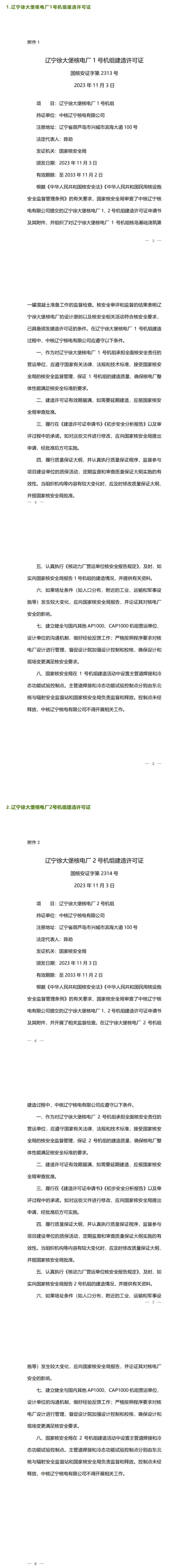 11月6日,生態(tài)環(huán)境部發(fā)布消息稱,國家核安全局決定向中核遼寧核電有限公司頒發(fā)《遼寧徐大堡核電廠1號機(jī)組建造許可證》和《遼寧徐大堡核電廠2號機(jī)組建造許可證》。