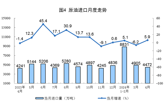 原油生產(chǎn)平穩(wěn)增長,進口由降轉增。4月份,規(guī)上工業(yè)原油產(chǎn)量1747萬噸,同比增長1.3%,增速比3月份加快0.1個百分點;日均產(chǎn)量58.2萬噸。進口原油4472萬噸,同比增長5.9%。