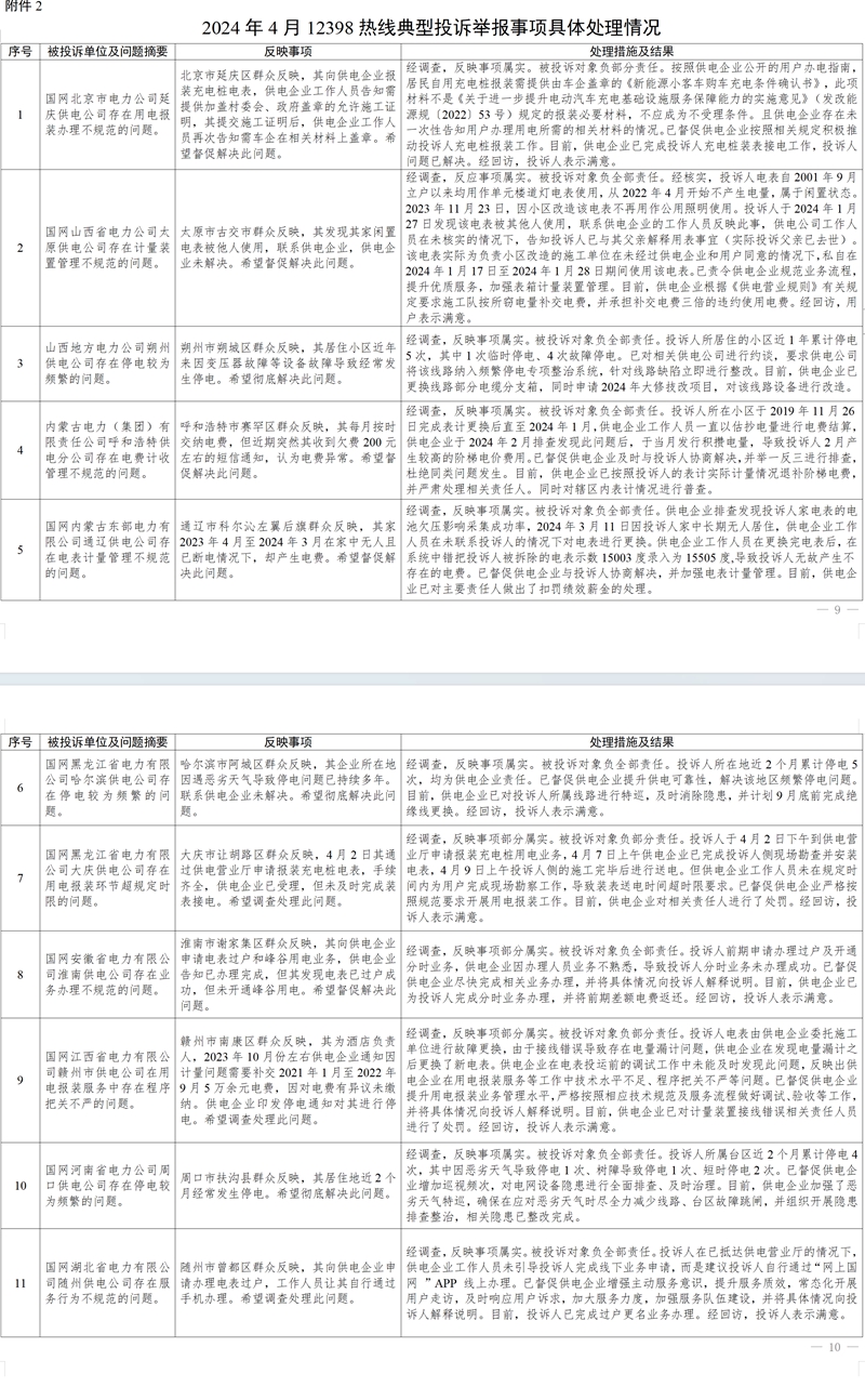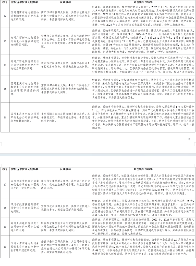 針對(duì)群眾反映的投訴舉報(bào),國家能源局派出機(jī)構(gòu)嚴(yán)格根據(jù)國家有關(guān)法規(guī)政策進(jìn)行處理。一是督促供電企業(yè)加強(qiáng)臺(tái)區(qū)等設(shè)備改造力度,縮短供電半徑,提高電網(wǎng)轉(zhuǎn)供、互供能力,有效解決故障停電、低電壓等電能質(zhì)量問題,進(jìn)一步提升供電可靠性;二是要求供電企業(yè)加強(qiáng)設(shè)備隱患排查整治和停電搶修管理,加強(qiáng)線路巡視頻次,及時(shí)消除隱患缺陷,增加搶修資源投入,提升設(shè)備管控和停電搶修能力,切實(shí)提高供電質(zhì)量;三是通過行政處罰、監(jiān)管約談、責(zé)令整改等方式,糾正有關(guān)企業(yè)違法違規(guī)行為,維護(hù)公平公正的市場秩序和群眾合法權(quán)益;四是通過解釋說明、澄清事實(shí),使群眾消除誤解。(2024年4月12398熱線典型投訴舉報(bào)事項(xiàng)具體處理情況,見附件2)