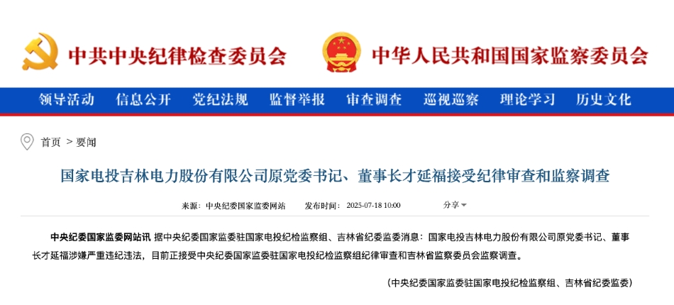 中央紀(jì)委國家監(jiān)委網(wǎng)站7月18日消息,據(jù)中央紀(jì)委國家監(jiān)委駐國家電投紀(jì)檢監(jiān)察組、吉林省紀(jì)委監(jiān)委消息:國家電投吉林電力股份有限公司原黨委書記、董事長才延福涉嫌嚴(yán)重違紀(jì)違法,目前正接受中央紀(jì)委國家監(jiān)委駐國家電投紀(jì)檢監(jiān)察組紀(jì)律審查和吉林省監(jiān)察委員會監(jiān)察調(diào)查。