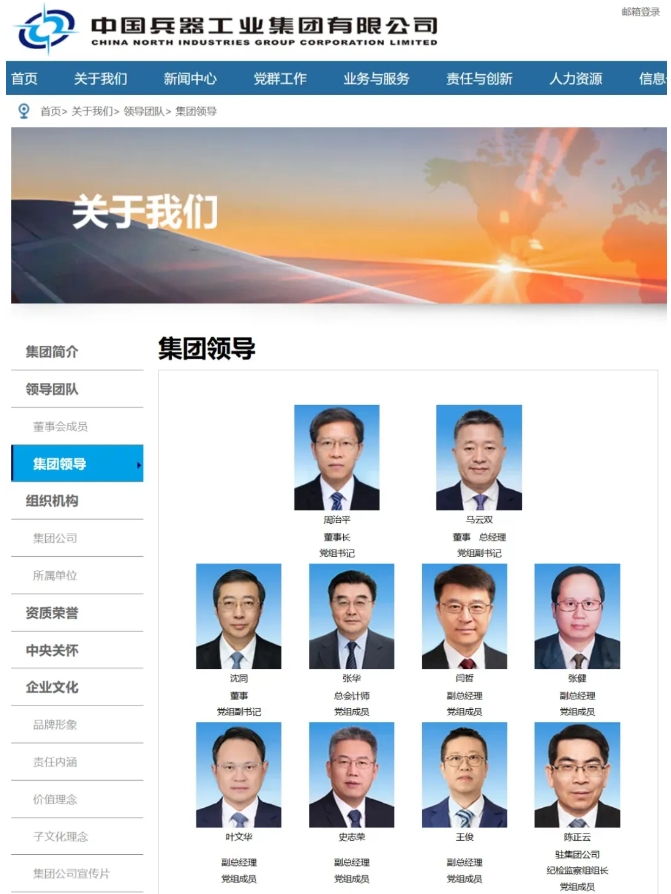 中國兵器工業(yè)集團(tuán)有限公司官網(wǎng)“集團(tuán)領(lǐng)導(dǎo)”一欄最新信息顯示,沈