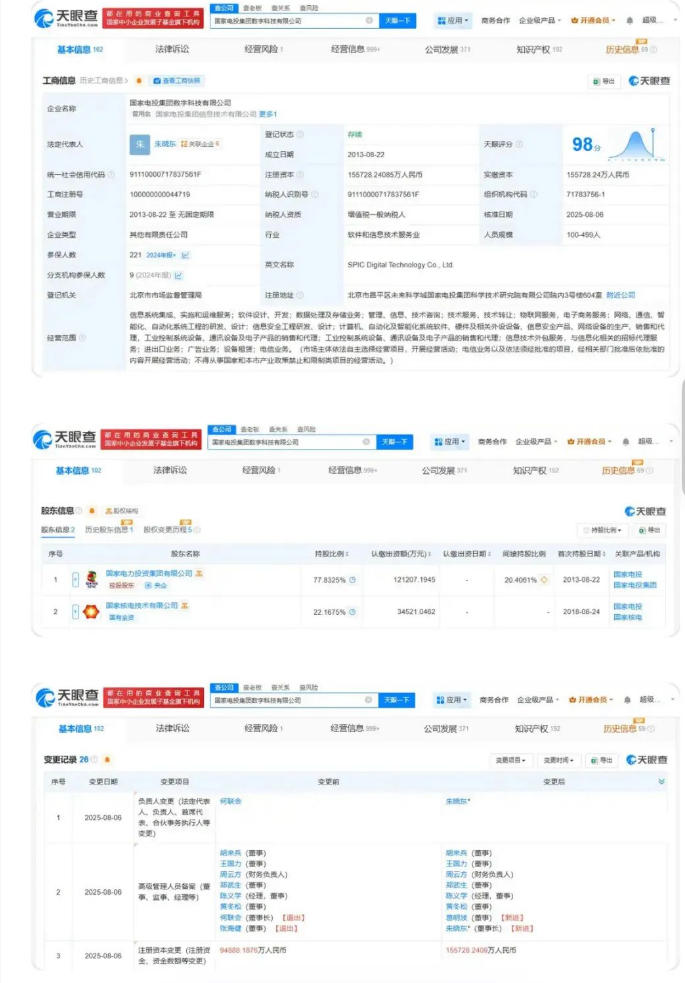 天眼查App顯示,近日,國家電投集團(tuán)數(shù)字科技有限公司發(fā)生工商變更,何聯(lián)會卸任法定代表人、董事長,由朱曉東接任,同時注冊資本由約9.49億人民幣增至約15.57億人民幣。
