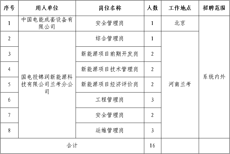 為加快推進(jìn)公司新興產(chǎn)業(yè)落地,保障各項(xiàng)經(jīng)營(yíng)管理工作有序開(kāi)展,根據(jù)相關(guān)所屬企業(yè)用人實(shí)際,面向國(guó)家電投集團(tuán)系統(tǒng)內(nèi)、外公開(kāi)選聘專業(yè)技術(shù)人員共16名?,F(xiàn)將有關(guān)事項(xiàng)公告如下: