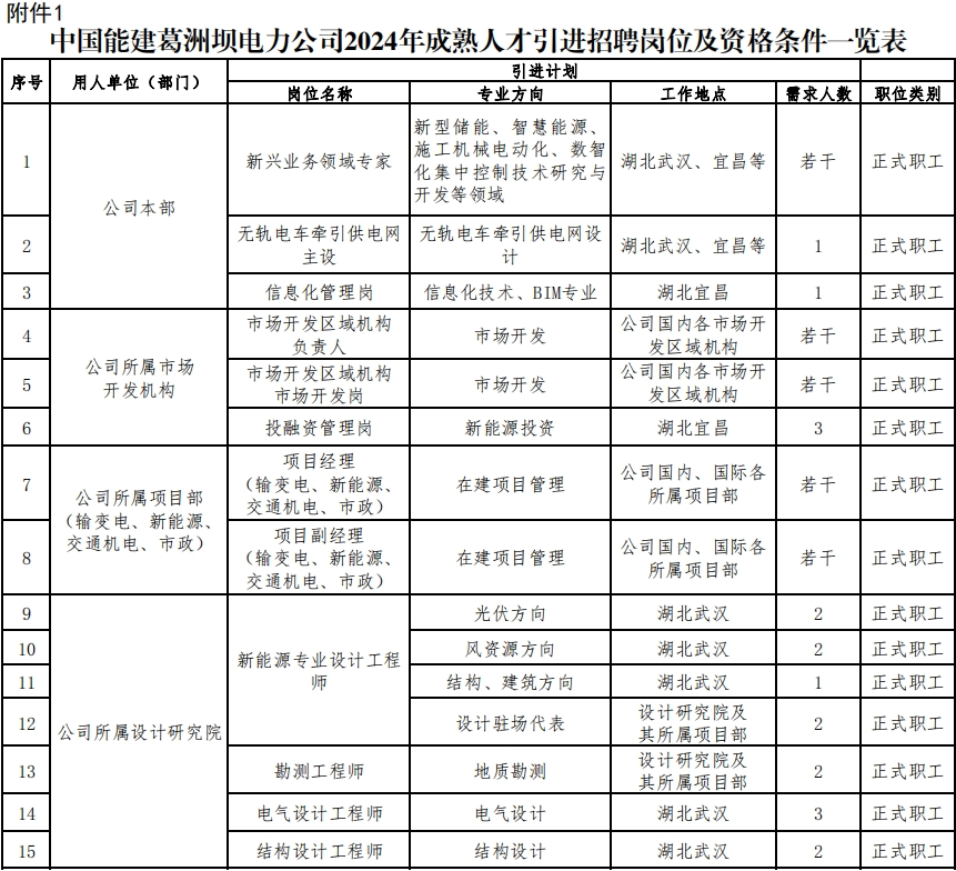 崗位詳細信息請點擊文末“閱讀原文”查看《中國能建葛洲壩電力公司2024年成熟人才引進招聘崗位及資格條件一覽表》(附件1)。