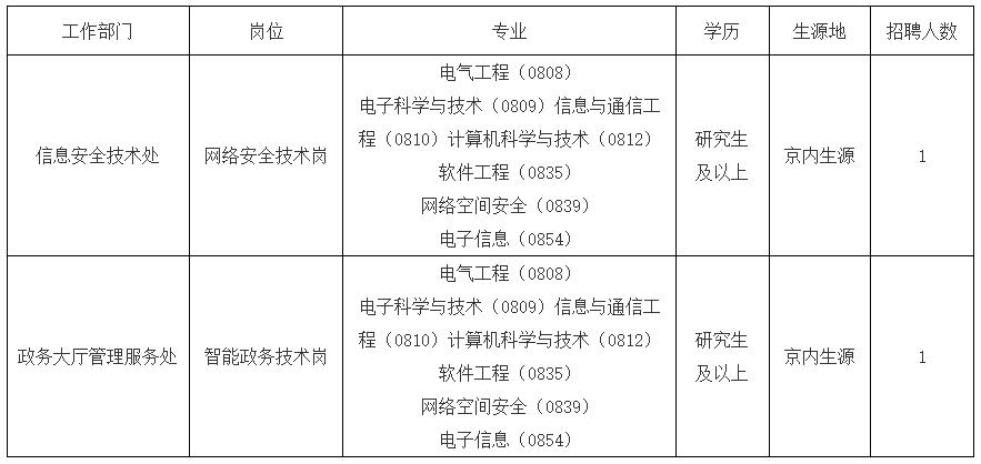 1.信息安全技術處:網(wǎng)絡安全技術崗工作人員1名(京內(nèi)生源研究生及以上應屆畢業(yè)生)。專業(yè)為電氣工程(0808)、電子科學與技術(0809)、信息與通信工程(0810)、計算機科學與技術(0812)、軟件工程(0835)、網(wǎng)絡空間安全(0839)、電子信息(0854)。要求熟悉網(wǎng)絡安全和數(shù)據(jù)安全防護技術、法律法規(guī)和管理知識,作風正派、嚴謹細致、踏實肯干,責任心強、執(zhí)行力強、服務意識強,具有較強的溝通協(xié)調(diào)能力和文字功底。