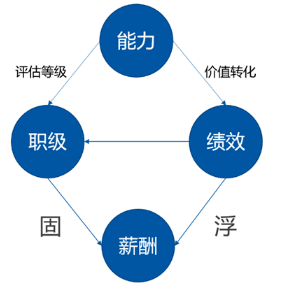 能力的評估結(jié)果體現(xiàn)為職級,能力的價值轉(zhuǎn)化體現(xiàn)為績效。我們根據(jù)能力等級定薪,通常體現(xiàn)為固定薪酬和目標(biāo)薪酬;為價值創(chuàng)造付薪,通常體現(xiàn)為浮動薪酬和實(shí)際薪酬。這就是我們?nèi)温氋Y格、績效管理、薪酬管理三大體系之間的關(guān)系。