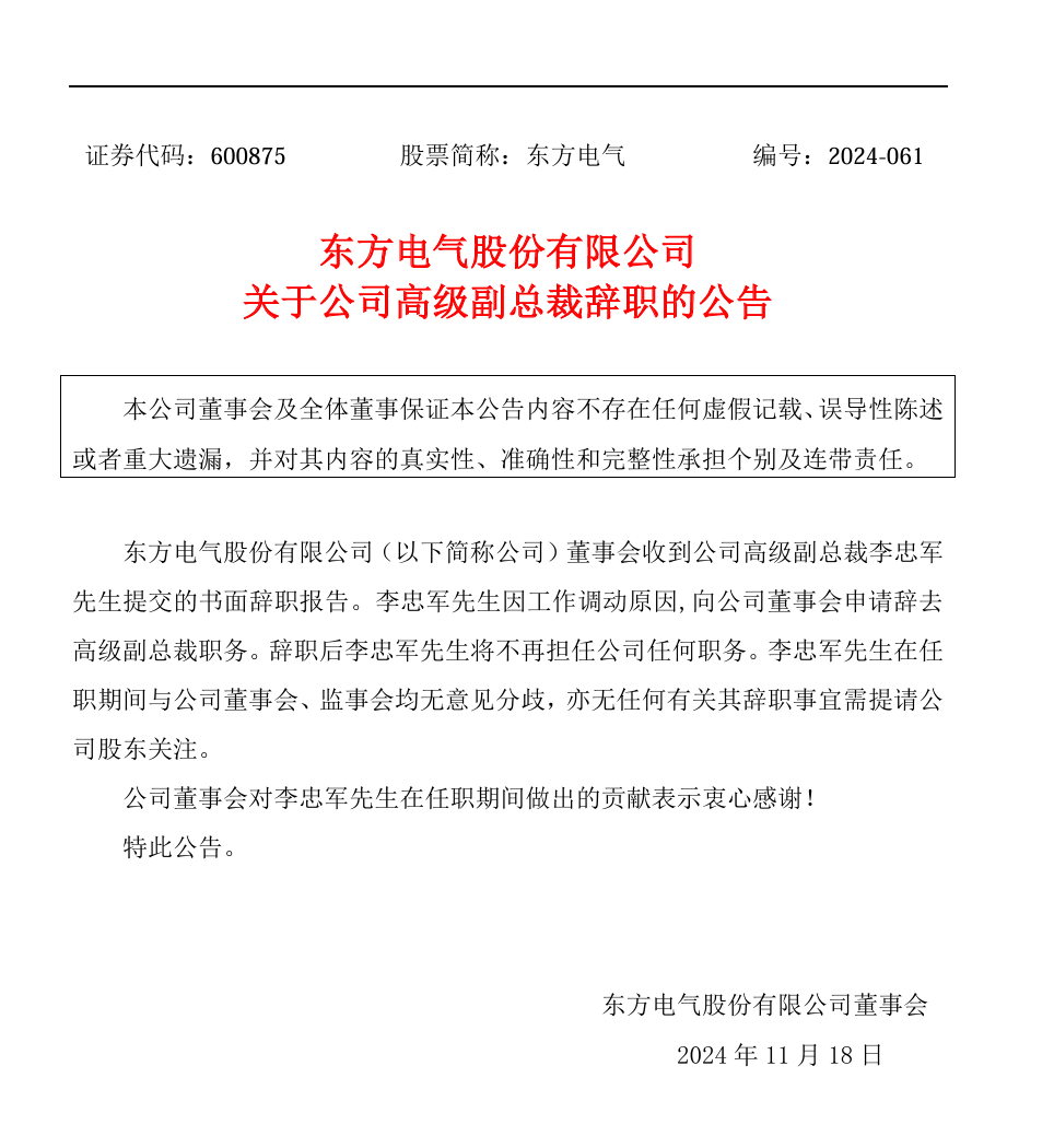 李忠軍辭去東方電氣股份有限公司(以下簡稱“東方電氣”)高級副總裁職務(wù)。