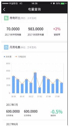 售電公司可在網上營業(yè)廳查詢客戶每月實際用電情況,安裝有計量采集系統(tǒng)的客戶還可以查看到每15分鐘一條的實際用電曲線,方便客戶了解自身用電情況,合理安排用電計劃,節(jié)省電費開銷。