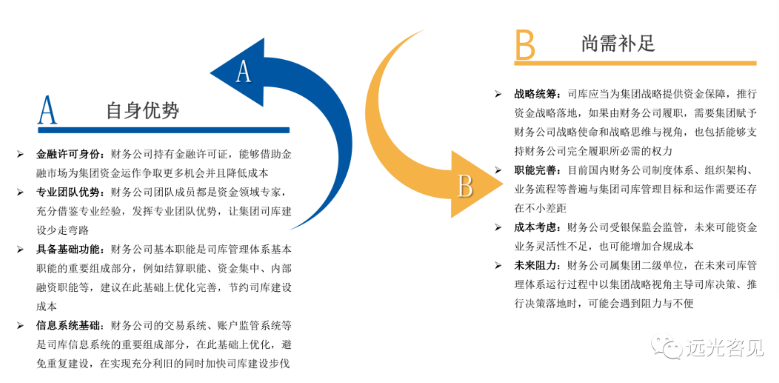 有不少企業(yè)會(huì)有困惑,是否可以以財(cái)務(wù)公司為基礎(chǔ)構(gòu)建司庫管理體系?這個(gè)不建議直接用“是\否”來回答,或許回答“部分可以”會(huì)比較適宜。從財(cái)務(wù)公司優(yōu)勢(shì)和可能存在的不足兩個(gè)角度進(jìn)行簡要分析,如圖: