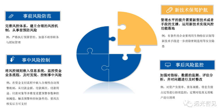總體來講,建議電力企業(yè)集團(tuán)根據(jù)監(jiān)管要求,結(jié)合自身管理特點(diǎn)和業(yè)務(wù)實(shí)際情況,對(duì)資金或司庫管理體系的風(fēng)控職能進(jìn)行統(tǒng)籌規(guī)劃,有些監(jiān)管要求的達(dá)成需要基于企業(yè)業(yè)務(wù)線上化基礎(chǔ),例如“實(shí)現(xiàn)事前事中事后的全過程監(jiān)控和各層級(jí)資金動(dòng)向的穿透式監(jiān)控”,這需要企業(yè)資金業(yè)務(wù)活動(dòng)過程文檔均已線上留痕才能實(shí)現(xiàn)推進(jìn)落地,以實(shí)現(xiàn)有效防范資金風(fēng)險(xiǎn)的目標(biāo)。