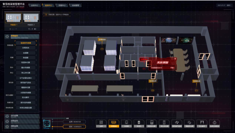 該系統(tǒng)包括了主控中心、監(jiān)控中心、告警中心、管理中心四大模塊:主控中心基于數(shù)字孿生理念,采用3d建模技術(shù),將檔案館的實(shí)時(shí)狀態(tài)、告警信息、統(tǒng)計(jì)分析進(jìn)行實(shí)時(shí)呈現(xiàn);監(jiān)控中心通過(guò)對(duì)檔案館的所有監(jiān)控設(shè)備進(jìn)行實(shí)時(shí)監(jiān)測(cè)與聯(lián)動(dòng)控制,以達(dá)到對(duì)館環(huán)境、安防的管控;告警中心提供了統(tǒng)一的告警引擎以及告警處理功能,可以快速處理系統(tǒng)告警;管理中心主要提供系統(tǒng)管理功能,具有系統(tǒng)基礎(chǔ)配置、數(shù)據(jù)分析的能力。