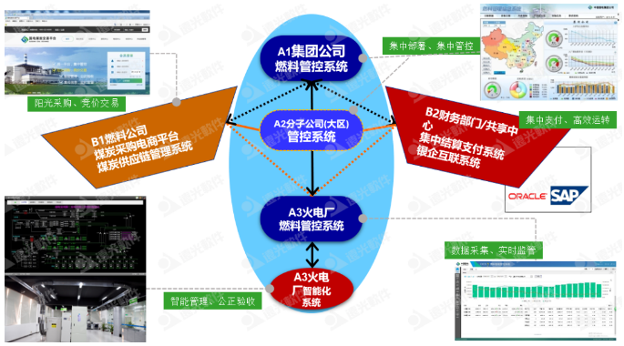 在縱向貫通方面,通過(guò)在集團(tuán)公司總部部署燃料管控信息系統(tǒng),以集中部署、集中管控為實(shí)施原則,發(fā)揮集團(tuán)公司的計(jì)劃管理和實(shí)施監(jiān)督的管理職能。在分(子)公司部署燃料管控系統(tǒng),作為燃料縱向三級(jí)管控中承上啟下的“橋梁”,對(duì)下屬電廠采購(gòu)、入廠、結(jié)算實(shí)施監(jiān)管,同時(shí)進(jìn)行區(qū)域內(nèi)調(diào)控;協(xié)助集團(tuán)公司進(jìn)行保供控價(jià)的執(zhí)行,落實(shí)集團(tuán)對(duì)燃料指標(biāo)管控要求。在電廠部署燃料管控信息系統(tǒng)(A2)與燃料智能化系統(tǒng)(A3),作為燃料管控的執(zhí)行主體,內(nèi)容包括入廠計(jì)量過(guò)程智能化系統(tǒng)、采制樣過(guò)程智能化系統(tǒng)、化驗(yàn)管理網(wǎng)絡(luò)化系統(tǒng)、煤場(chǎng)管理數(shù)字化系統(tǒng)、入爐煤管理系統(tǒng)、門(mén)禁系統(tǒng)、燃料集中監(jiān)控系統(tǒng)和監(jiān)控中心、燃料業(yè)務(wù)管理系統(tǒng)。