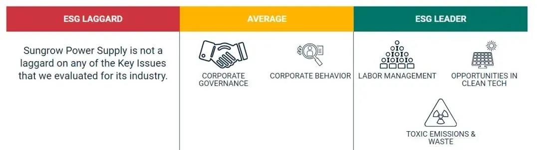 核心ESG議題方面,陽光電源在勞工管理、清潔能源機(jī)遇,以及有害排放和廢棄物三個指標(biāo)方面都處于行業(yè)領(lǐng)先位置,沒有議題落后于同業(yè)企業(yè)。