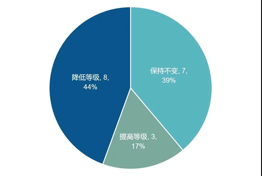 在18家ESG評級結(jié)果得到調(diào)整的A股中,有8家公司(44%)的評級被調(diào)低,有7家公司(39%)的評級保持不變,僅有3家公司(17%)的評級被調(diào)高。