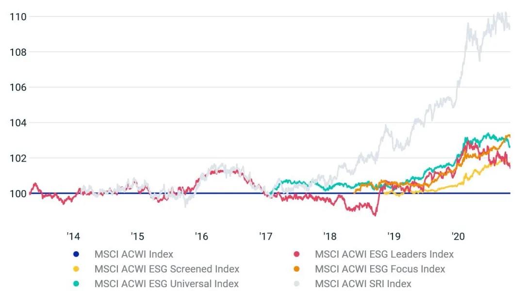 圖:相對基準(zhǔn)的MSCI ACWI ESG指數(shù)系列表現(xiàn)
