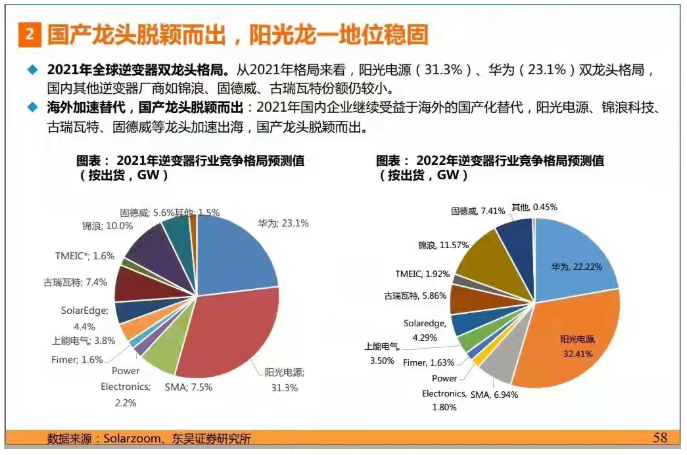 經(jīng)過(guò)多年大浪淘沙式的行業(yè)洗牌后,馬太效應(yīng)凸顯,2021年全球逆變器呈現(xiàn)雙龍頭格局。從2021年格局來(lái)看,陽(yáng)光電源占據(jù)31.3%的市場(chǎng),而華為占據(jù)23.1%。
