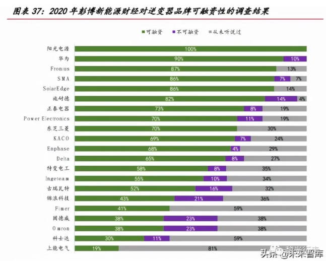 2020年彭博新能源財(cái)經(jīng)通過(guò)向可再生能源項(xiàng)目的投資方發(fā)放問(wèn)卷等形式,對(duì)逆變器品牌的可融資性進(jìn)行了調(diào)查。排名較高的品牌意味著更易幫助項(xiàng)目開(kāi)發(fā)商獲得銀行融資,利于綁定長(zhǎng)期客戶(hù)群體;另一方面說(shuō)明該品牌逆變器在產(chǎn)品質(zhì)量、運(yùn)行表現(xiàn)、售后服務(wù)支持和長(zhǎng)期可靠性方面表現(xiàn)突出,利于海外布局的拓展。陽(yáng)光電源以100%的得票率當(dāng)選“全球最具融資價(jià)值的逆變器品牌”,華為位居第2名,共有9家中國(guó)企業(yè)上榜。重要的是,該調(diào)查結(jié)果展現(xiàn)出國(guó)內(nèi)逆變器企業(yè)在海外擴(kuò)張業(yè)務(wù)的過(guò)程中,品牌價(jià)值得到提升,逐步得到海外投資方的認(rèn)可。