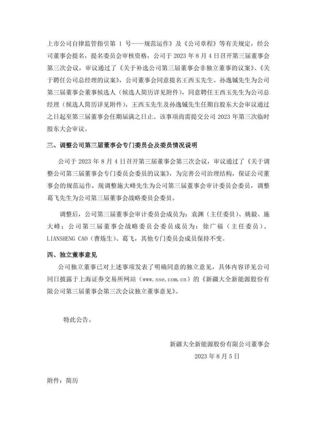 此外,公司董事會(huì)同意提名王西玉、孫逸鋮為公司第三屆董事會(huì)董事候選人,同意聘任王西玉為公司總經(jīng)理,王西玉及孫逸鋮任期自股東大會(huì)審議通過之日起至第三屆董事會(huì)任期屆滿之日止。該事項(xiàng)尚需提交公司2023年第三次臨時(shí)股東大會(huì)審議。