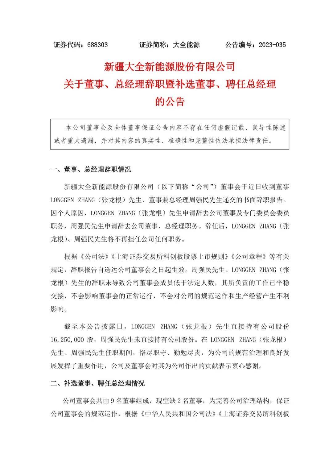 新疆大全新能源股份有限公司(以下簡(jiǎn)稱“大全能源”)董事張龍根、董事兼總經(jīng)理周強(qiáng)民辭職。