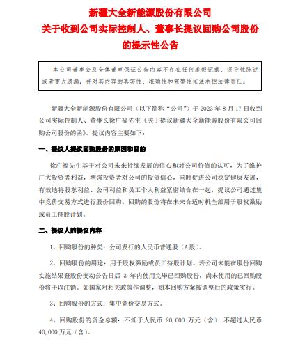 大全能源:實(shí)控人、董事長(zhǎng)徐廣福提議以2億元-4億元回購(gòu)公司股份